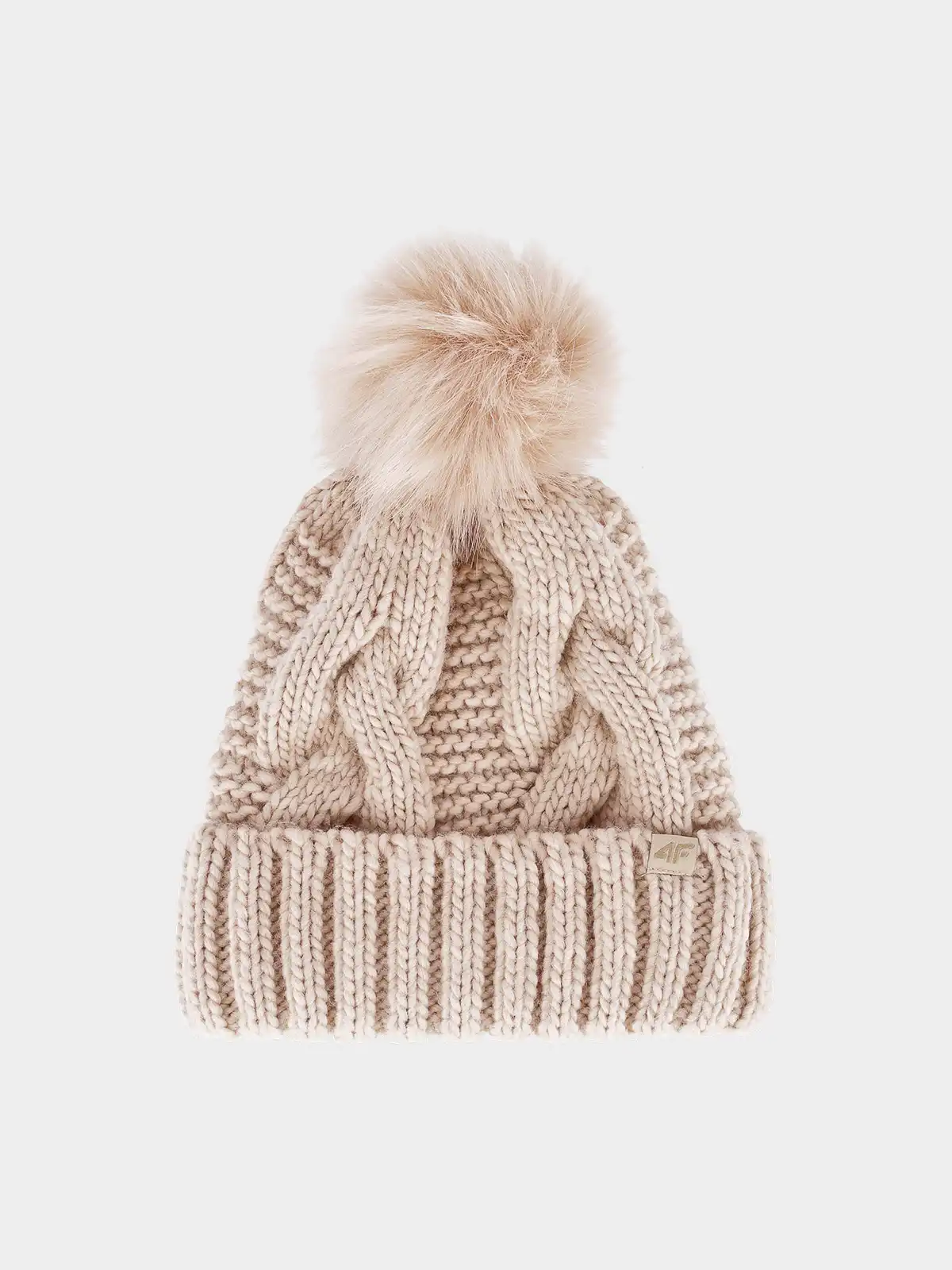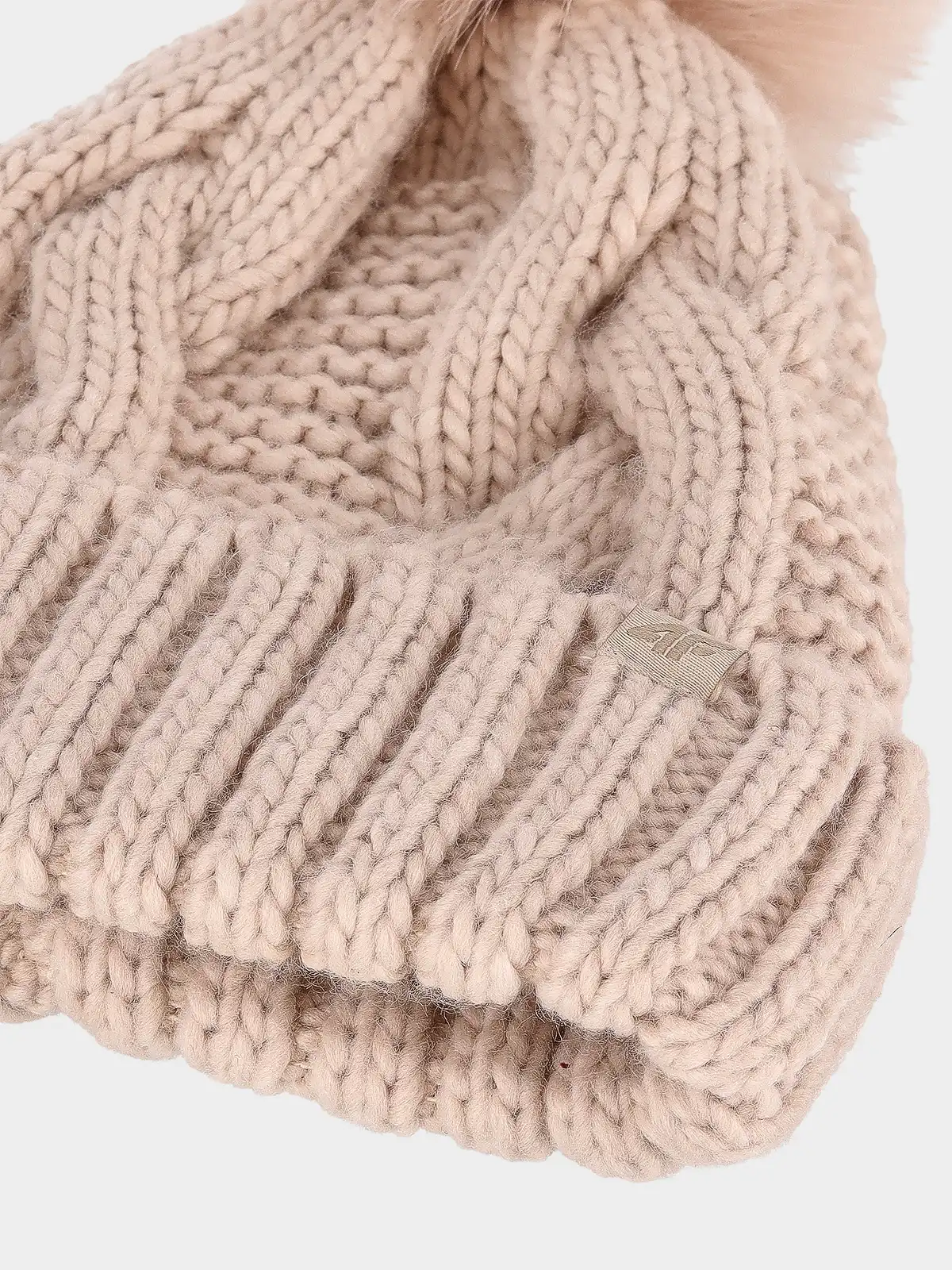 Czapka zimowa damska 4F w beżowym kolorze to stylowy i praktyczny dodatek na chłodne dni. Gruba, mięsista dzianina skutecznie chroni przed zimnem, zapewniając odpowiedni komfort termiczny podczas spacerów i zimowych aktywności. Jednolita, elegancka kolorystyka sprawia, że model doskonale komponuje się zarówno z klasycznym płaszczem, jak i sportową kurtką. Wewnętrzny pas z miękkiego polaru zwiększa poziom ciepła oraz komfortu noszenia, jednocześnie minimalizując ryzyko podrażnień skóry. Złożony mankiet tworzy podwójną warstwę materiału na wysokości uszu, co poprawia izolację i stabilność dopasowania. Elastyczna konstrukcja dobrze układa się na głowie, nie uciskając i nie zsuwając się podczas ruchu. Miękki pompon ze sztucznego futra nadaje czapce kobiecego, przytulnego charakteru i stanowi estetyczne wykończenie całości. To model, który łączy funkcjonalność z modnym wyglądem i sprawdzi się w miejskich stylizacjach oraz podczas aktywności na świeżym powietrzu.