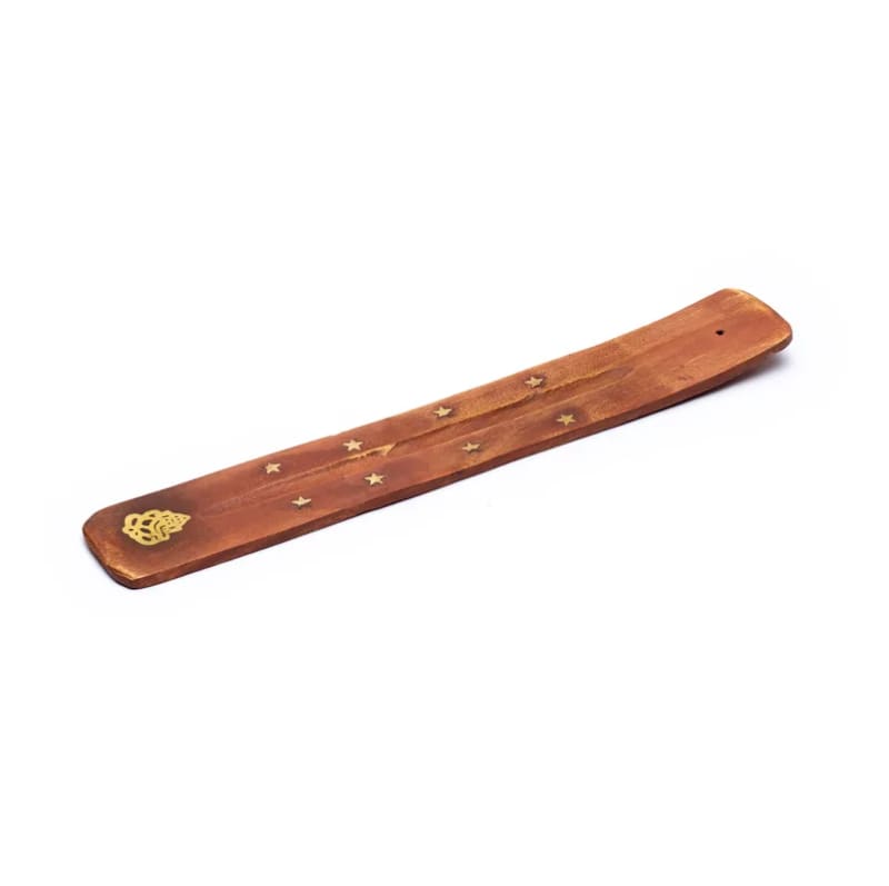 Dekoracyjna kadzielnica z inkrustowanym symbolem Ganeszy łączy naturalne drewno z duchową symboliką. To funkcjonalne i estetyczne akcesorium do palenia cienkich kadzideł, idealne do przestrzeni medytacyjnej i praktyki jogi.