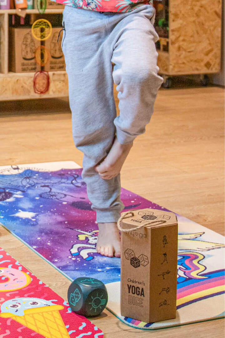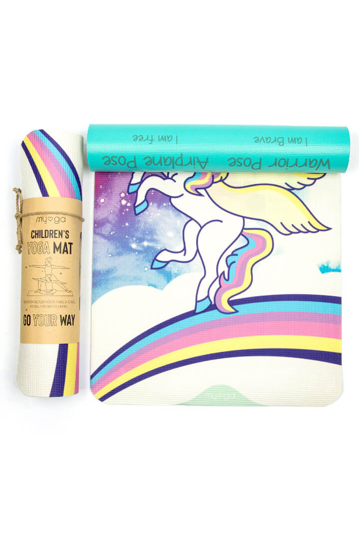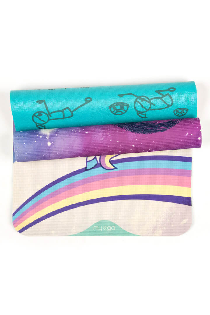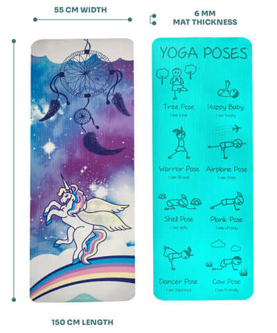 Na odwrocie maty znajdują się ilustracje ośmiu podstawowych pozycji jogi, które w prosty i zabawny sposób pomagają dzieciom uczyć się i zapamiętywać asany. Lekka konstrukcja i kompaktowe wymiary sprawiają, że mata jest łatwa do przenoszenia, dzięki czemu dziecko może zabrać ją wszędzie — do szkoły, studia jogi czy na zajęcia ruchowe.