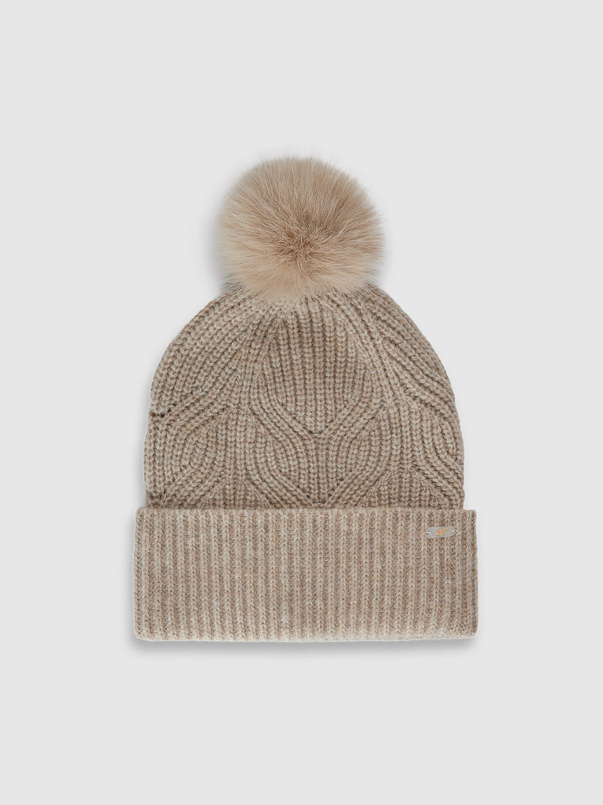To klasyczna czapka beanie z pięknym dekoracyjnym splotem, wywijanym mankietem i puszystym pomponem, który dodaje jej uroku i zimowego klimatu.