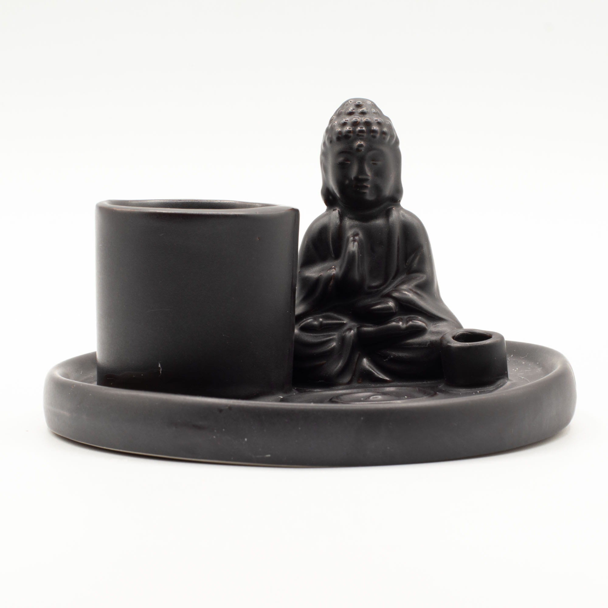 Wielofunkcyjna podstawka pod kadzidełka Budda – czarna matowa to uniwersalne akcesorium do tworzenia spokojnej, uważnej atmosfery w domu lub studio. Okrągła baza skutecznie zbiera popiół, pomagając zachować czystość podczas palenia kadzideł. Przemyślana konstrukcja umożliwia bezpieczne użytkowanie kadzidełek patyczkowych, stożków, pęczków ziół oraz drewienek Palo Santo. Matowe, czarne wykończenie nadaje podstawce nowoczesny i stonowany charakter, podkreślając jej formę bez zbędnych ozdobników. Motyw Buddy w połączeniu z minimalistycznym designem sprzyja wyciszeniu i koncentracji. Ceramika odporna na wysoką temperaturę zapewnia stabilność i trwałość nawet przy regularnym, codziennym użytkowaniu. Gładka powierzchnia ułatwia czyszczenie i pielęgnację. Podstawka pełni zarówno funkcję praktyczną, jak i dekoracyjną, subtelnie dopełniając aranżację strefy wellness. Doskonale komponuje się z wnętrzami nowoczesnymi, klasycznymi i minimalistycznymi. Może być oferowana jako samodzielny produkt lub element większej kolekcji akcesoriów zapachowych. To świadomy wybór dla osób ceniących prostotę, spokój i jakość.