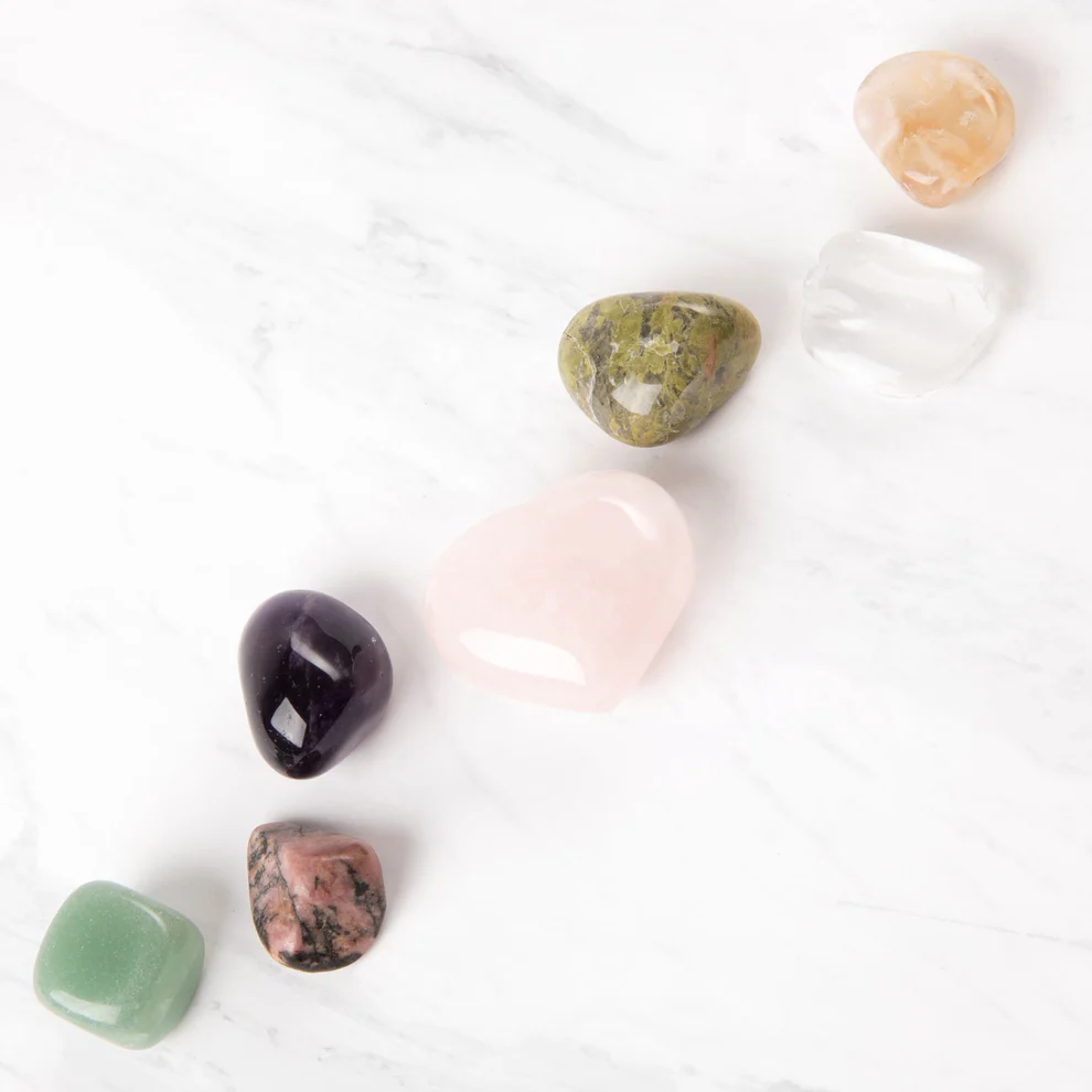 Zestaw Love Crystal Set to starannie dobrana kompozycja siedmiu polerowanych kamieni, których energia sprzyja budowaniu wewnętrznej harmonii oraz pogłębianiu kontaktu z miłością – zarówno do siebie, jak i do otaczającego świata. Każdy z kryształów wyróżnia się własną częstotliwością i właściwościami, które wspierają emocjonalną równowagę, intuicję oraz spokój ducha. Ametyst pomaga wyciszyć umysł i pogłębia wgląd duchowy, podczas gdy agat sakura wzmacnia poczucie własnej mocy i rozwija intuicję. Zielony awenturyn sprzyja uzdrawianiu serca i przyciąganiu szczęścia, a różowy kwarc wspiera proces emocjonalnego otwarcia i budowania zaufania. Kryształ górski oczyszcza energię i wzmacnia intencje, natomiast unakit pogłębia empatię i wspólnotową więź. Całość uzupełnia rodonit, który równoważy emocje i wprowadza więcej radości do codzienności. Zestaw jest doskonałym narzędziem dla osób medytujących, praktykujących holistyczną pracę z energią lub szukających estetycznego, naturalnego akcentu do domowej przestrzeni.